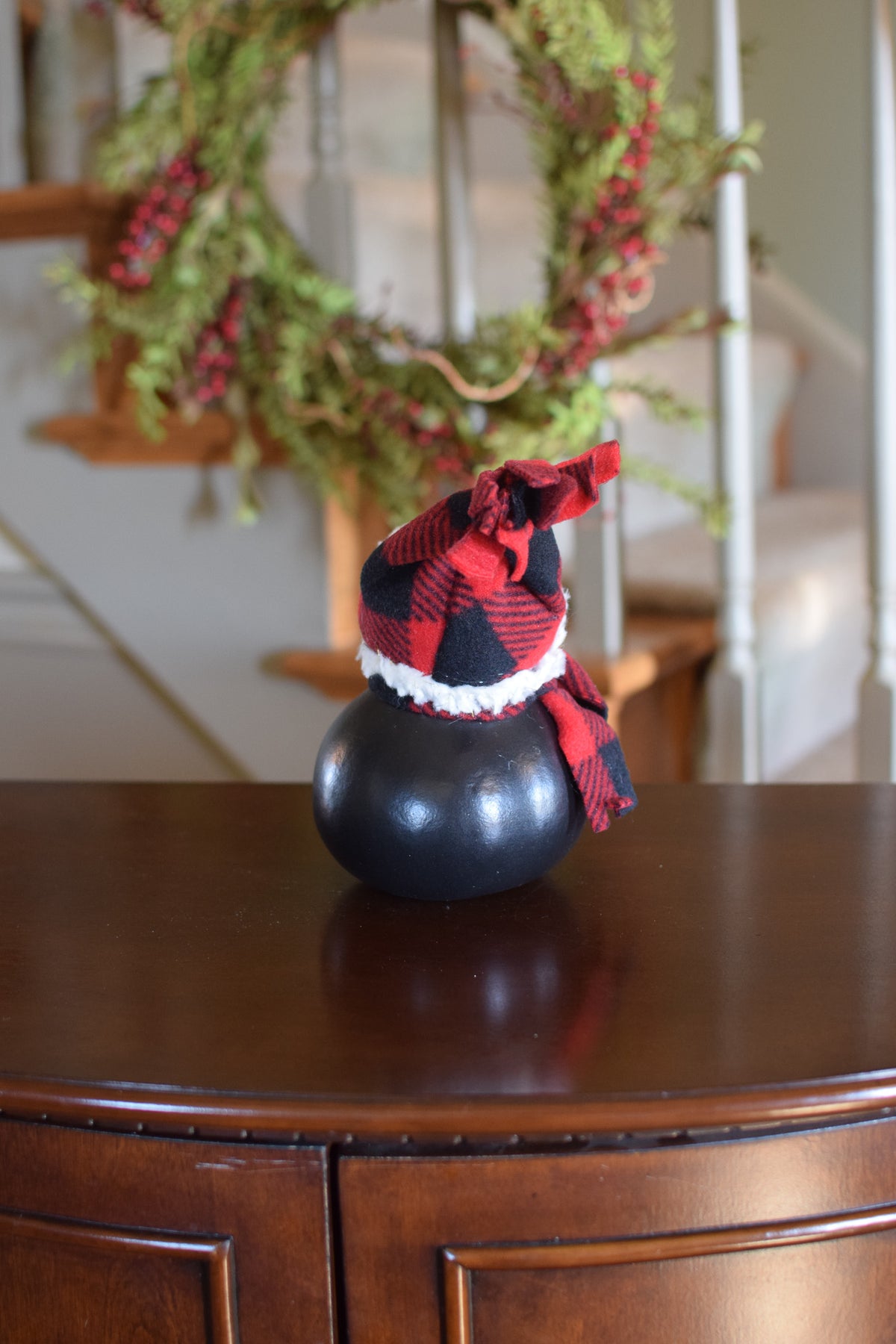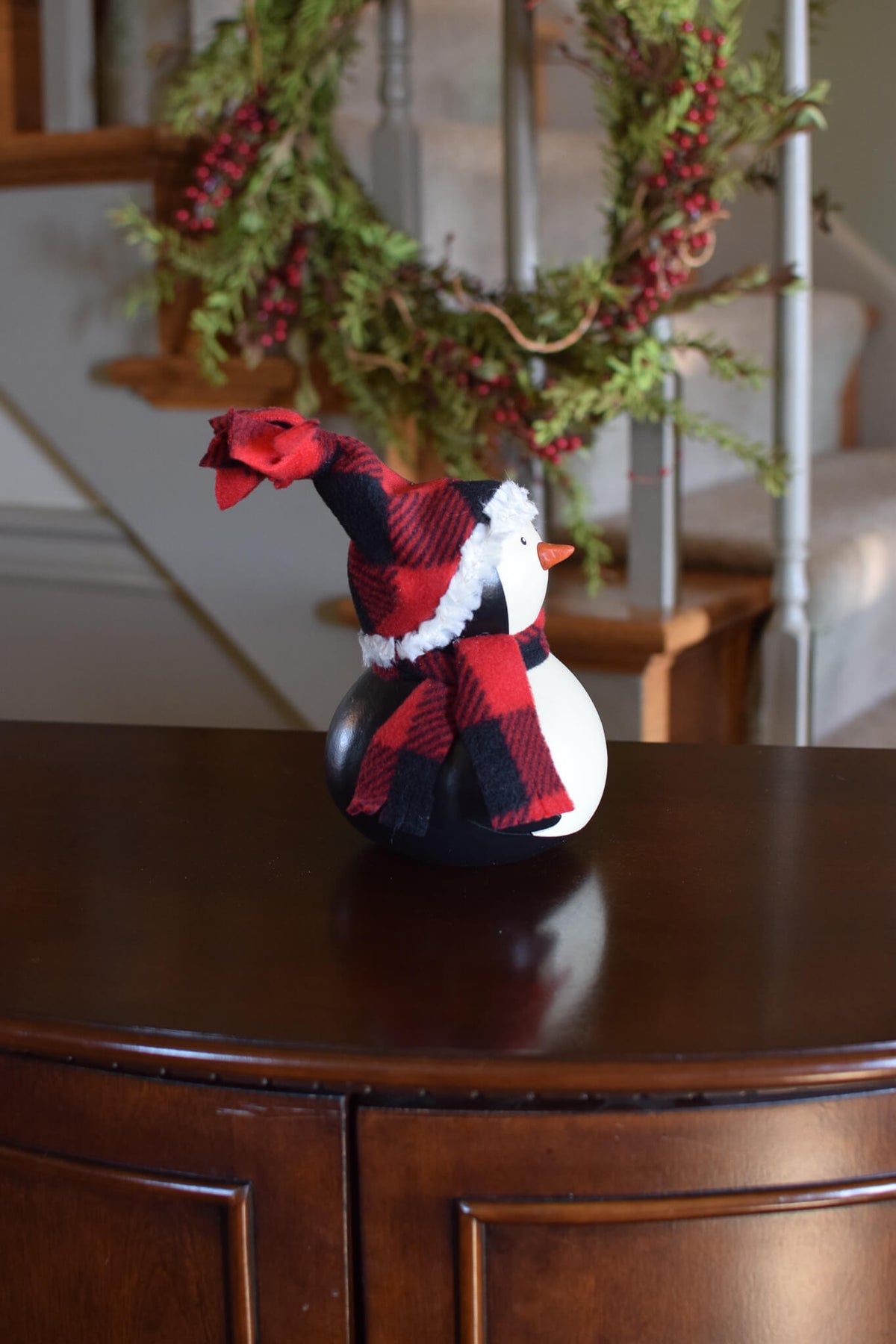 Parkin is our adorable penguin. She has a white belly and a warm black/red checkered scarf and sock hat.  He has an orange hand made clay beak. Approximately 5" in diameter and 8" tall.