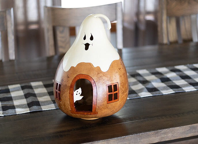 The Small Project has five different bodies to choose from and five different heads. You can mix and match these heads and bodies to make your perfect fall design. The small bodies that are available are: a pumpkin, a bat/moon/star, three leaves, three bats, and a blank body with turkey feet. The heads that are available are a witch, ghost, scarecrow, turkey and bat. You will also be able to choose to make an owl, pumpkin luminary or casper jack. These gourds can be lit with a battery-operated tea light for an additional charge ($1.00) or our NEW electric base light ($5.00). These designs are approximately 3 1/2" in diameter.