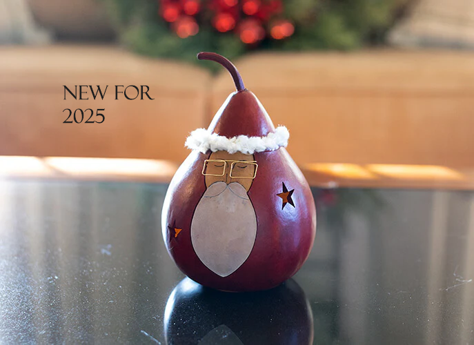 The Large Projects that you can make include an angel, snowman, Santa, bear and campfire gourd. The Campfire gourd Santa and Santa Pants Candy Dish gourd are made from one gourd. New this year we have a tall santa. The heads that you can mix and match include an angel, bear and snowman. The bodies designs that you can choose from are a snowflake and tree. These pieces can be lit with an electric light for an additional charge ($5.00).
