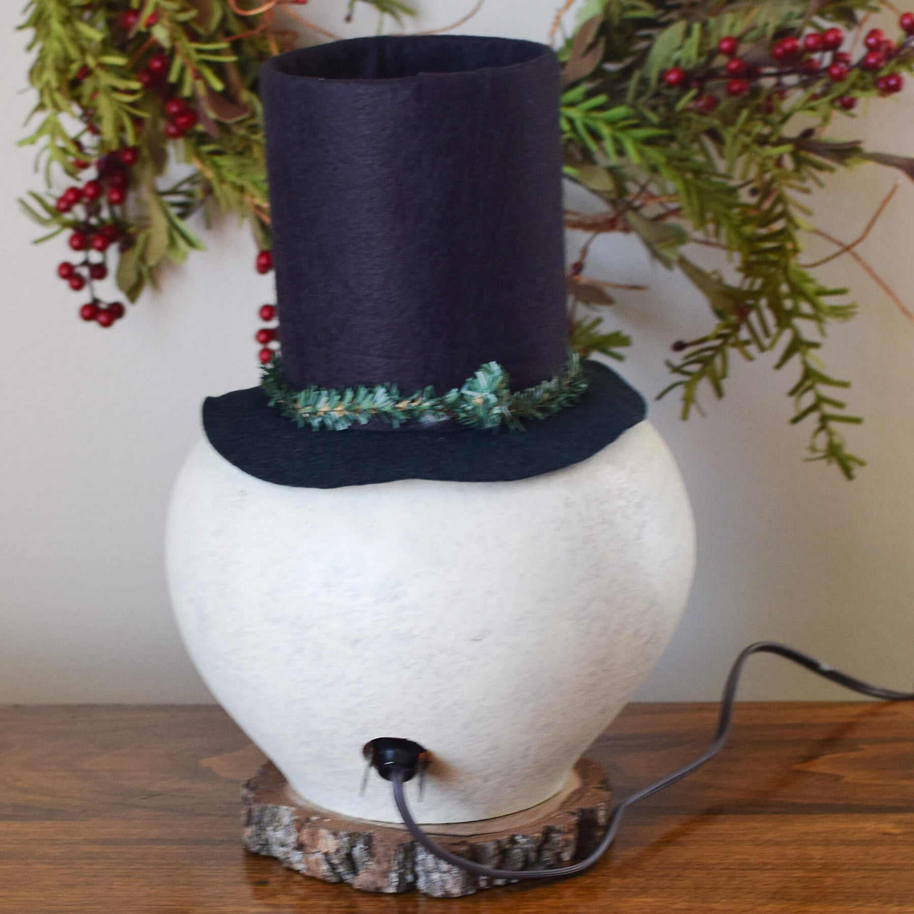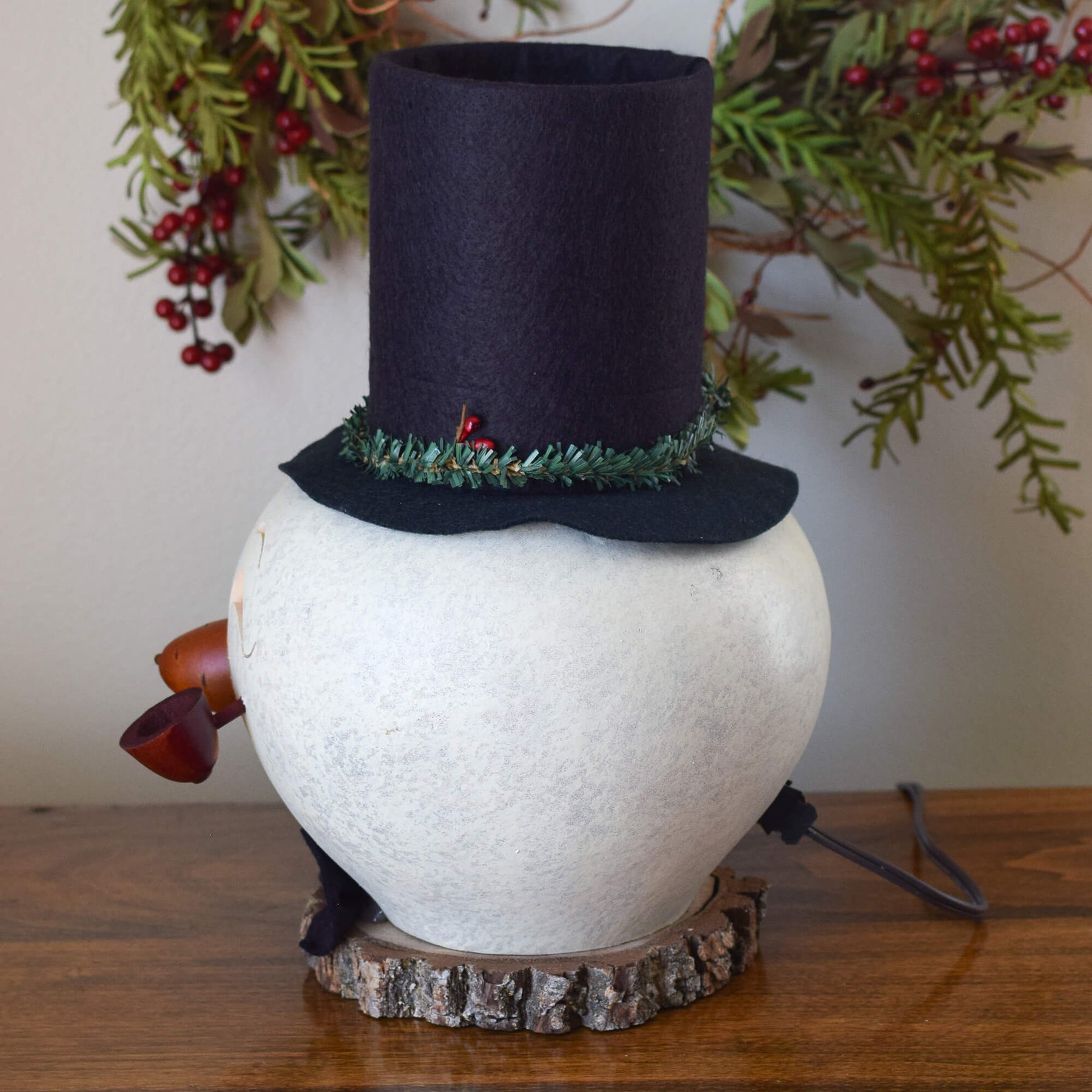 Clyde is our winking snowman head that is sponged white in color. He has a playful handcrafted winking face and a red gourd pipe. His top hat is handmade. He has an orange gourd nose and a handmade black bow tie.