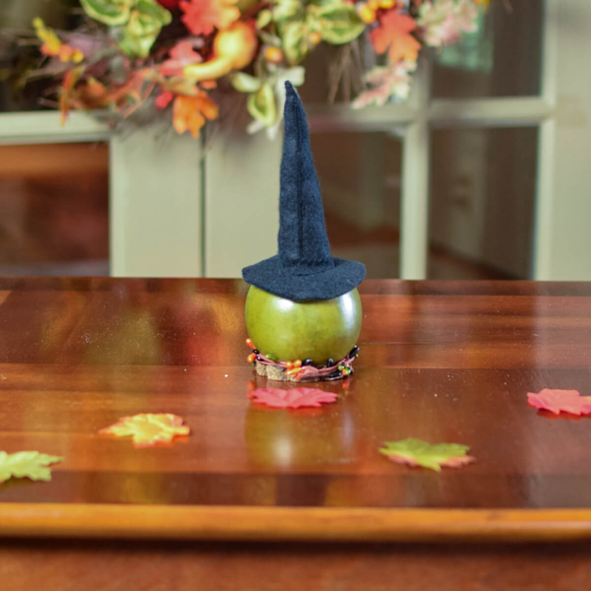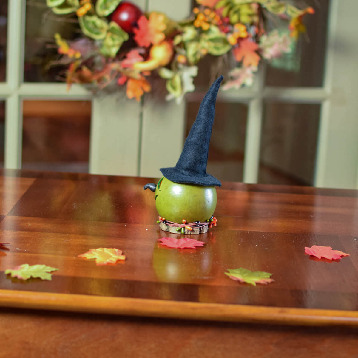 This gourd witch comes on a wooden biscuit base. She is green in color with a hand made black hat. She has a hand made clay nose. Berries adorn the wood base. She is sold unlit but can be lit by purchasing a battery-operated tea light. She is approximately 3" in diameter and 8" tall. She is the perfect size to add with any of your fall décor.