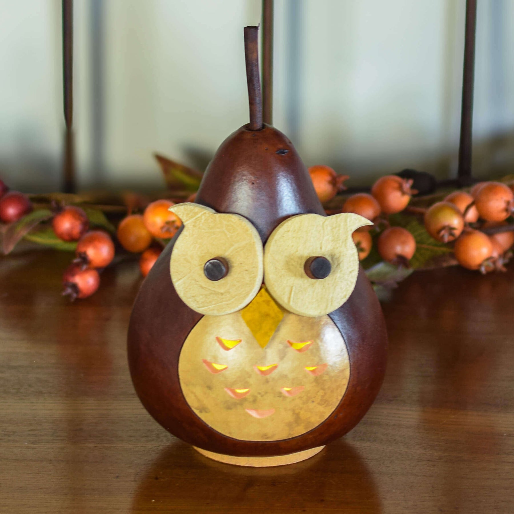 Professor Owl is sure to brighten up any home. He is dyed walnut and has a natural colored belly. He has fun gourd eyes and a gourd beak. Approximately 5 1/2" in diameter and 7 1/2" tall. Comes with an electric light. He is a great fall decoration that you can leave out for the whole season.